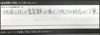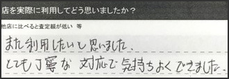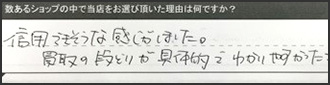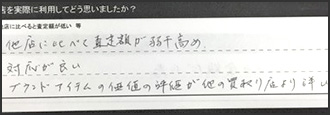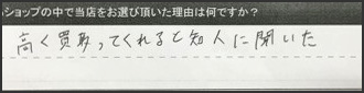 こうしたお言葉に甘んじることなく、今後もご期待にお応えできるよう、ご納得いただける査定金額と、安心してお取引いただける対応を心がけてまいります。